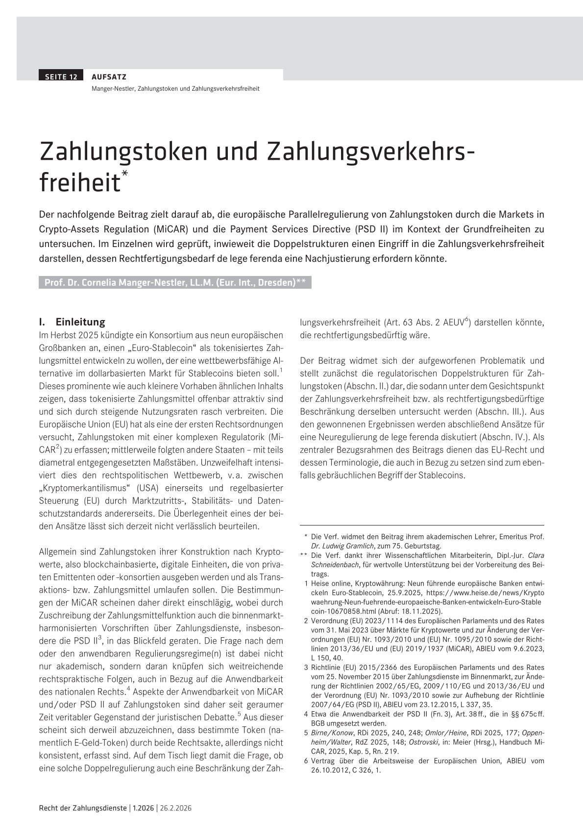 In dem Artikel "Zur Rechtsnatur des digitalen Euro als funktionales Bargeldäquivalent" (RdZ 2024, 170 ff.) widmet sich Frau Prof. Dr. Cornelia Manger-Nestler in einer differenzierten Auseinandersetzung mit dem Verordnungsentwurf der Europäischen Kommission zum digitalen Euro (COM [2023] 369 final) der Frage nach der Rechtsnatur des digitalen Euro sowie möglichen Gestaltungsspielräumen im weiteren Gesetzgebungsprozess. Den Beitrag finden Sie hier.